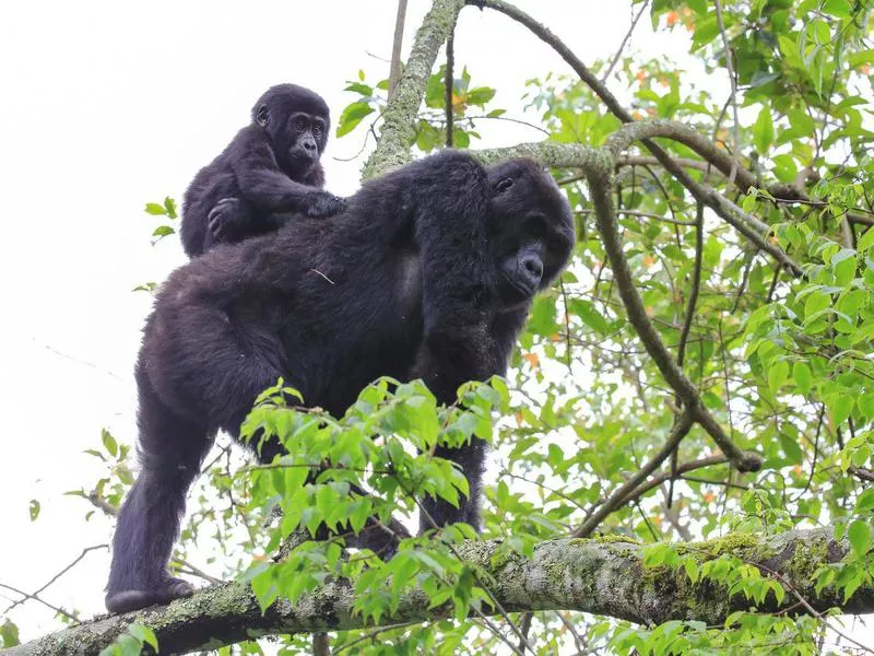 Baby mountain gorilla on the back of its mother in the Bwindi Impenetrable Forest National Park in Western Uganda. Getty Images