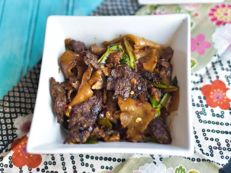 Meaning "fried soy sauce," pad see ew is Thai stir-fried noodles made with flank steak or chicken thighs and drowned in soy sauce, dark soy sauce and oyster sauce. The dish is not spicy and is often much sweeter than pad thai, typically containing a bit of sugar.