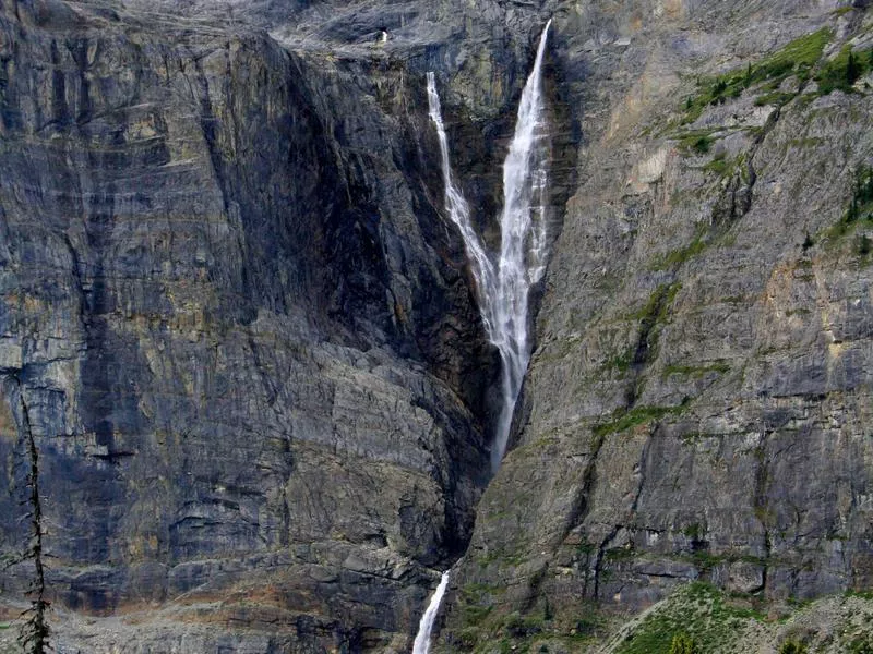 One of the tallest waterfalls in the Canadian Rocky Mountains is Helmet Falls. There are two streams that are fed by three glaciers that merge at the top of the falls to form the main plunge. Water from Helmet Creek rushes out of the Washmawwapta Icefield, dropping over 1,000 feet to the valley below.