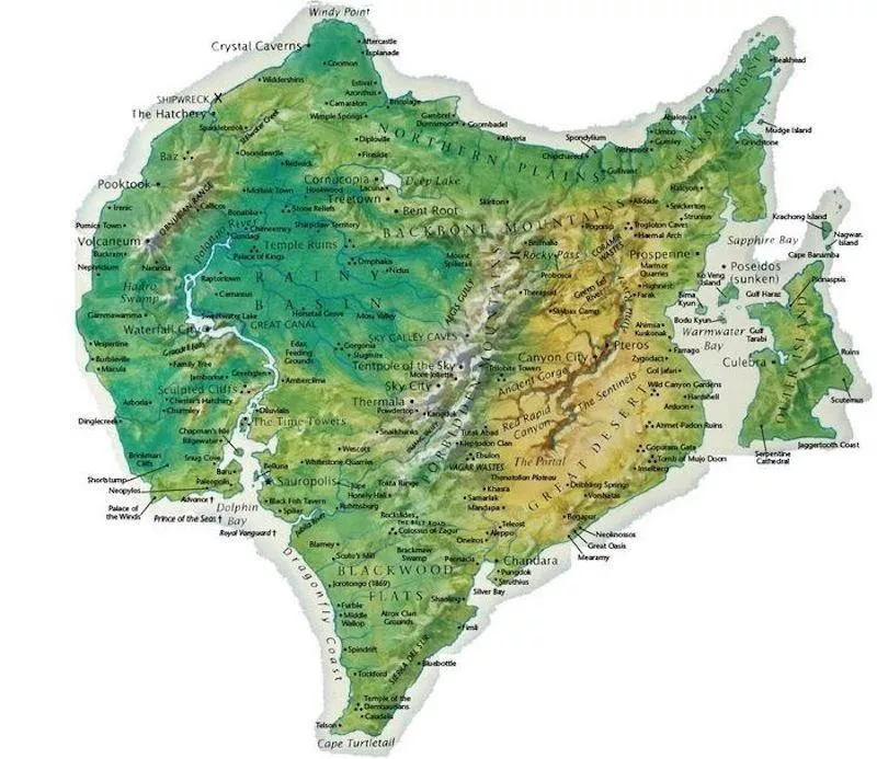 Sauropolis, the capital, is located on the main island, along with Rainy Basin, the Great Desert, Waterfall City and the Forbidden Mountains.
