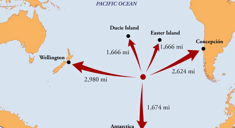 Point Nemo was identified in 1992 through distance calculations rather than exploration. It lies at 48°52.6 south latitude and 123°23.6 west longitude in the South Pacific between Easter Island and Antarctica. The nearest landmasses are located about 1,670 miles away, including Ducie Island to the north and Maher Island near Antarctica to the south.