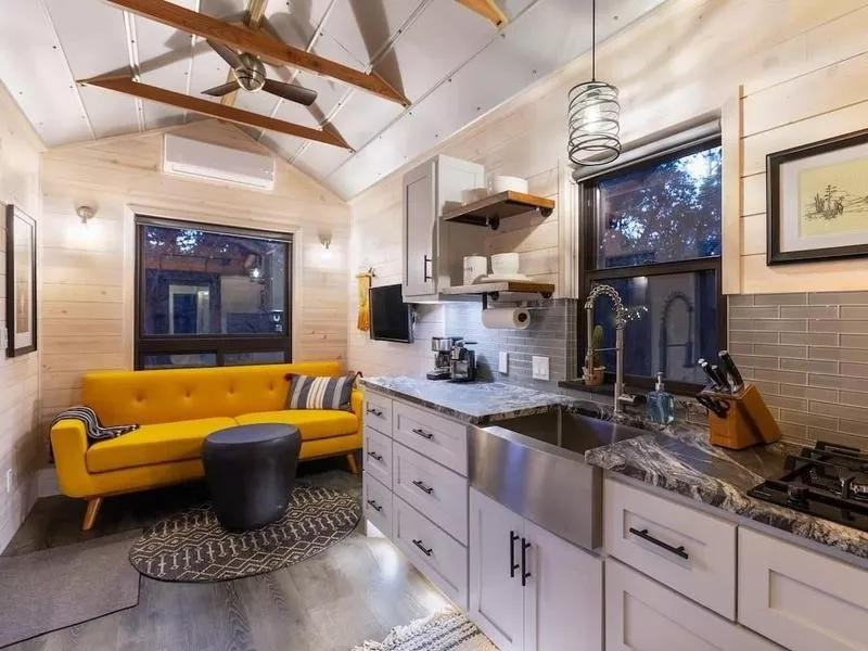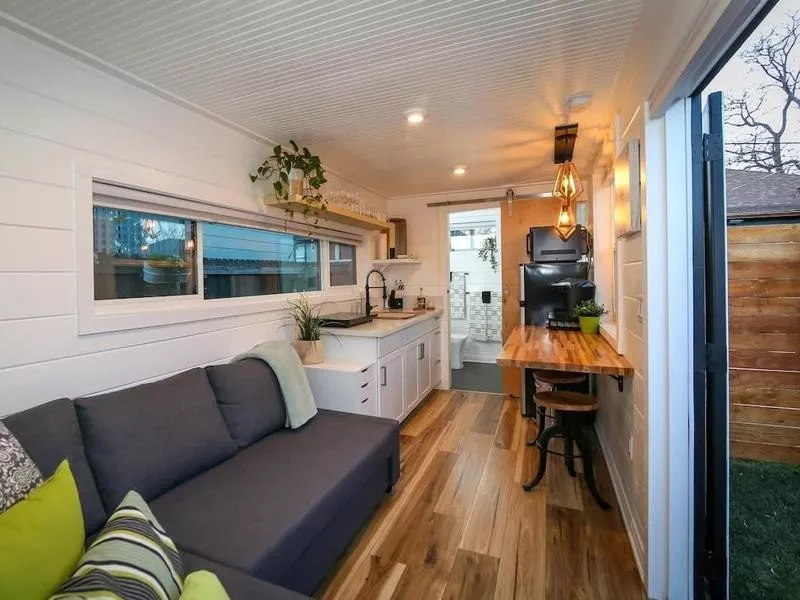 Nash Casita is a 320-square-foot tiny house in East Nashville, Tennessee. It’s designed for travelers and comes equipped with plenty of amenities to make you feel at home. The interior features a modern design with concrete floors, a couch, queen-size bed, bathroom, mini fridge and kitchen sink.