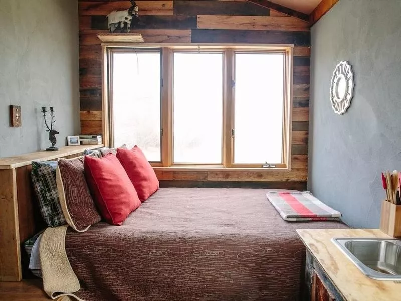 Open the French doors to watch an epic mountain sunset from bed. This tiny home has a five-star rating with guests raving about the location, hospitality and privacy.