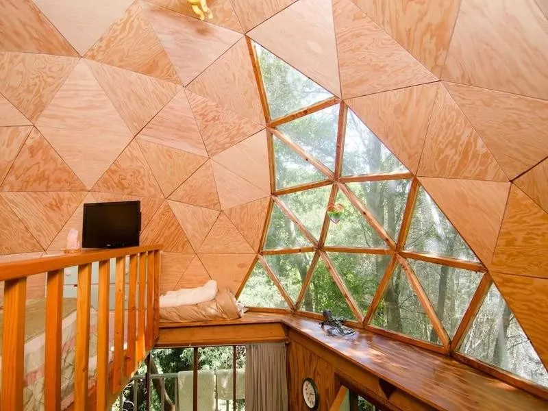 The Mushroom Dome is nestled on 10 acres of land just outside of Monterey, California. Guests are encouraged to hang out on the deck, hike in the woods, watch the hummingbirds, go to the beach or gaze at the stars.