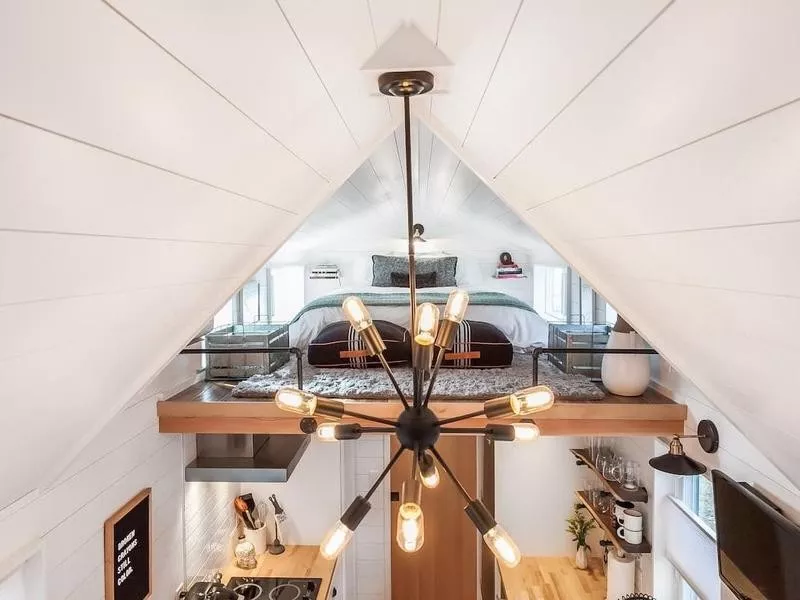 Bright, airy and wrapped in shiplap, this tiny house in Atlanta is packed with farmhouse charm and modern style. While it looks small on the outside, the inside fits one private bedroom and one loft, complete with a full kitchen and bathroom.