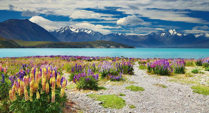 By December, the lake’s edges are lined with blooming lupins in shades of purple and pink. Early summer brings firmer trails, so hikes around the basin and nearby hills feel steadier underfoot. Many visitors also book scenic helicopter rides over Mount Cook to take in the bright, early-season views across the alpine landscape.
