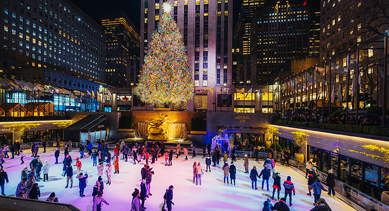December in New York leans on its classic holiday scene: the Rockefeller Center tree, Fifth Avenue displays, and the Dyker Heights lights, all busy enough to have their own guided tours. Skating rinks stay open through the season, including the one at Rockefeller Plaza. Cold snaps roll through often, which is why many people drift into hotel lobby bars with real fireplaces for a warm break between outings.